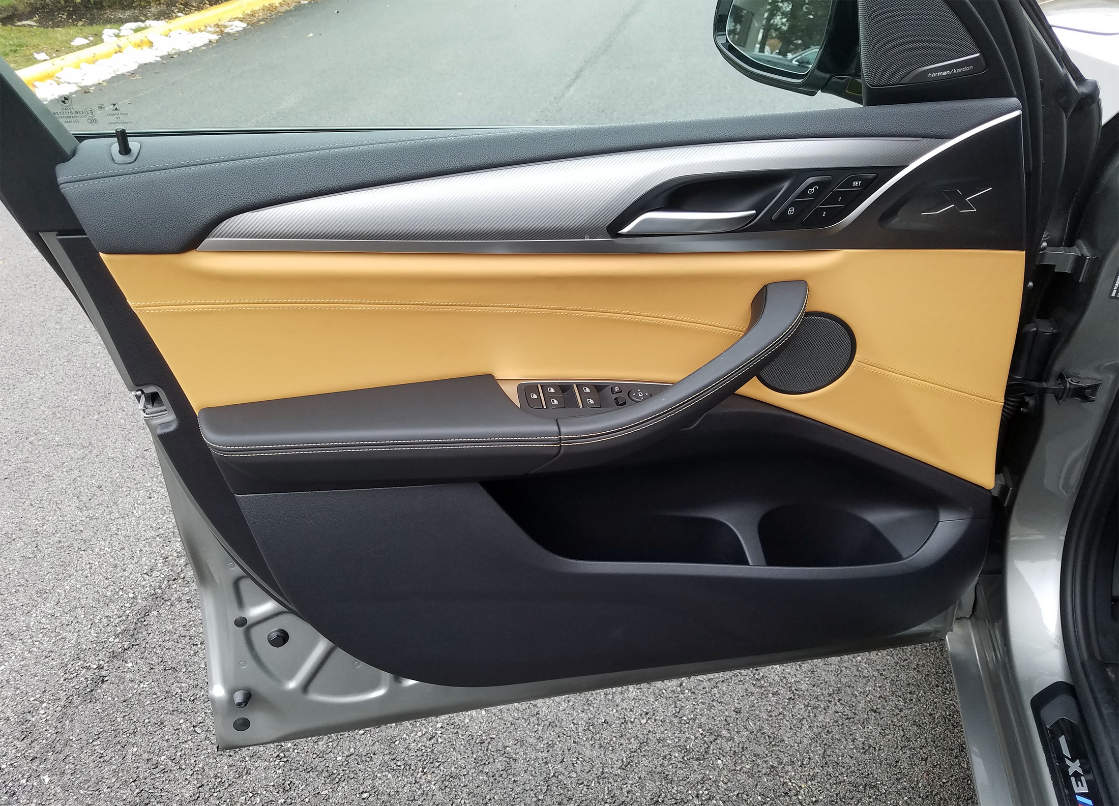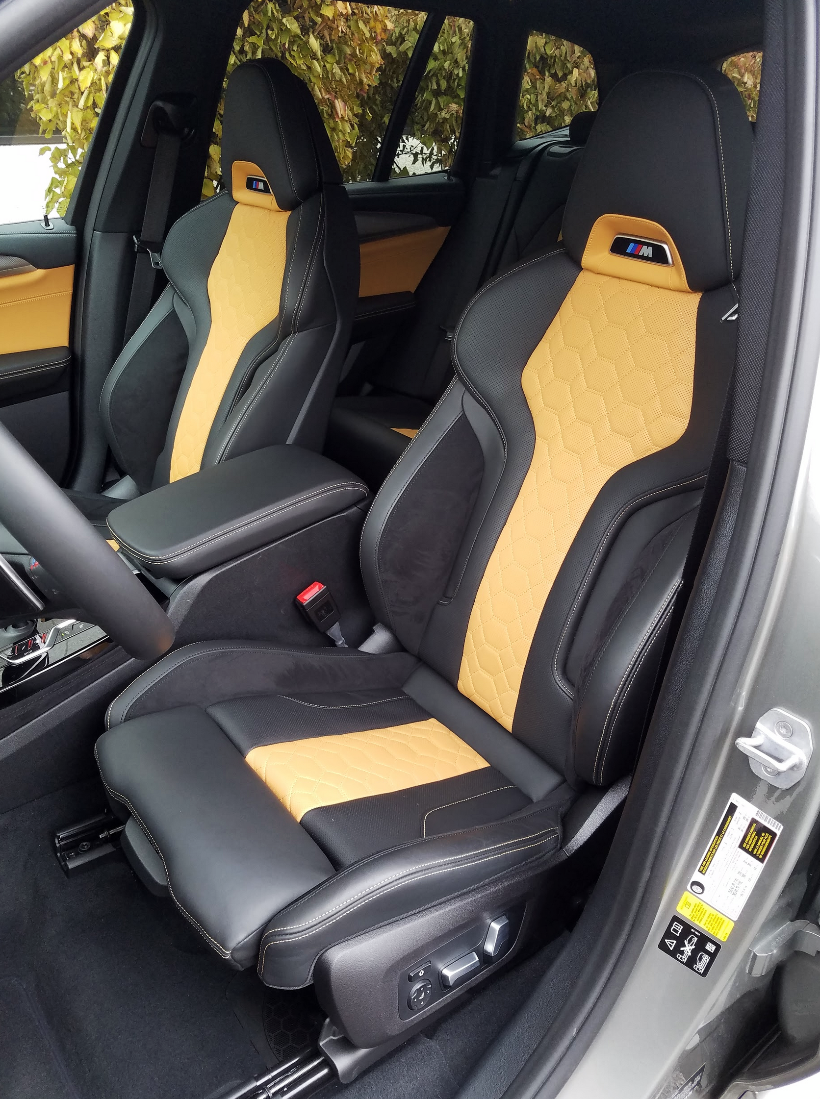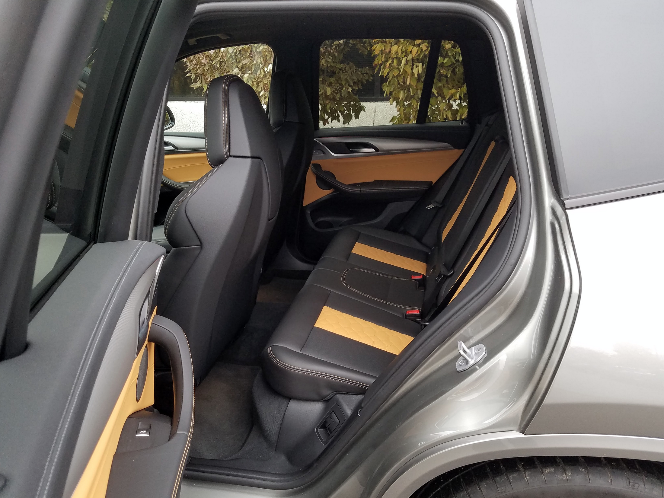 In those moments when the M Comp is being asked to live up to its potential, front-seat passengers are securely cupped in the high-back sport seats. Firm but supportive, they have 14-way power adjustment and 4-way lumbar support, plus a memory function for the driver’s seat. Alcantara suede-like fabric is applied to inner portions of the cushions and seat-back wings when the combination of Black and yellowy Midrand Beige leather is selected, as it was on CG’s test vehicle. The light-up logo in the headrests may be a gimmick, but it’s a neat one nonetheless. Front-seat space will satisfy the majority of folks who ride there, and there is nice rear-seat room for a compact SUV, though just two adults can reasonably be accommodated on the adjustable-back seats. Except for big B-pillars that impede the view to the side, driver vision is fairly good.