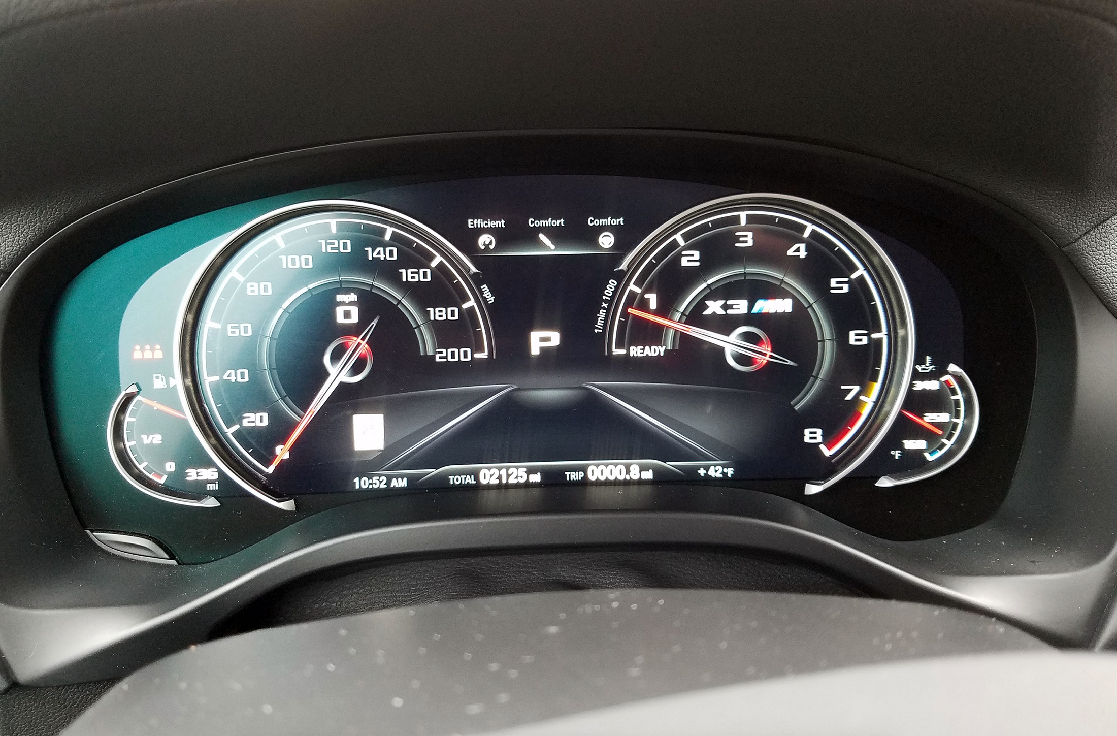 Ride is firm, even with the adaptive suspension set for “Comfort.” Advancing damper and steering resistance up through “Sport” and “Sport+” palpably improves control of body motions (at some sacrifice of ride comfort) and handling. With 50.1 percent of vehicle weight up front and 49.9 percent in back, the X3 M Competition is about as balanced as most sports cars would hope to be. Specially tuned all-wheel drive, an active differential, and standard launch control are all included to sharpen dynamic performance and traction. The blue-caliper M Sport disc brakes, with 4-piston grip in front, hold fast right away.