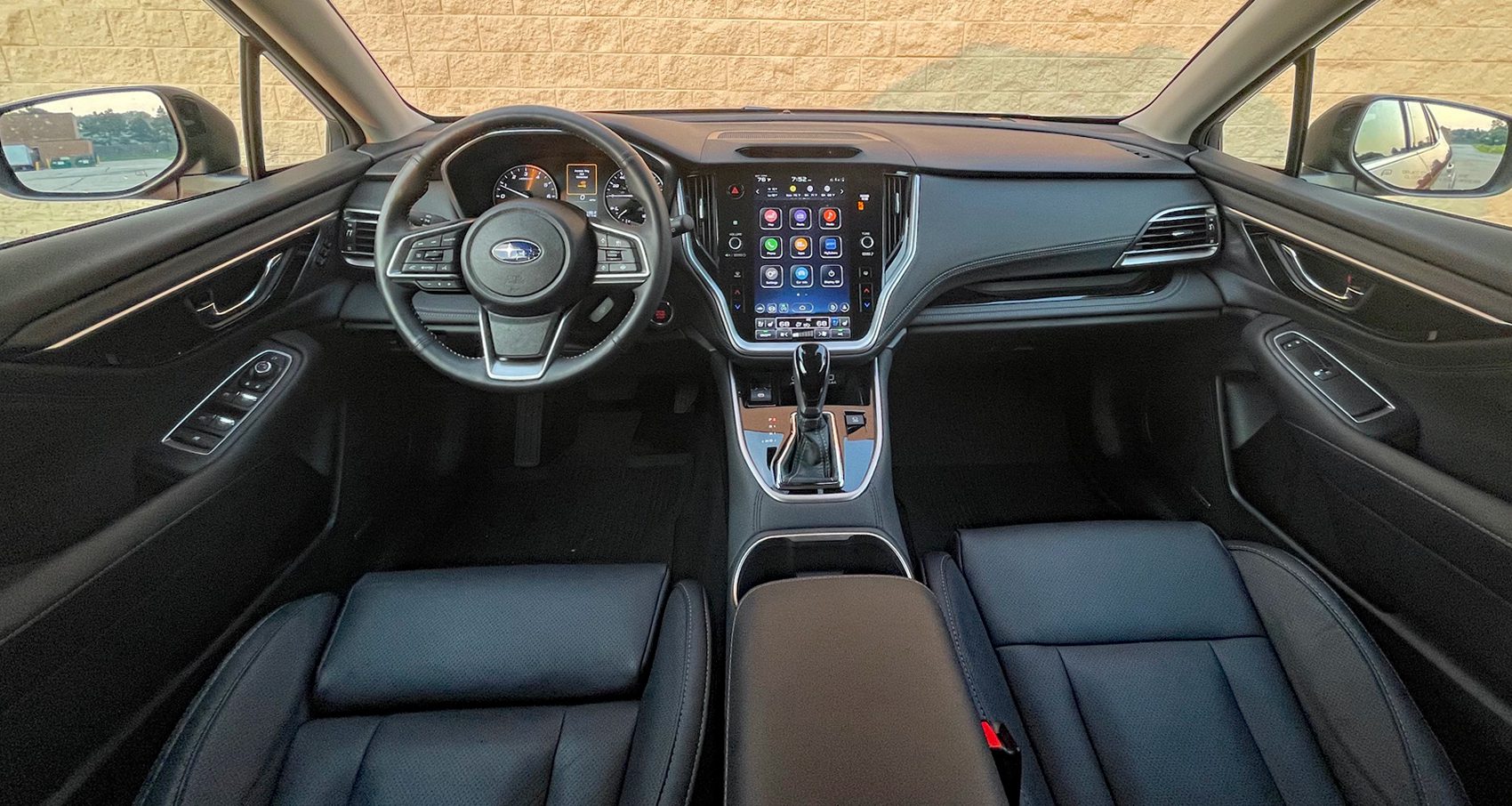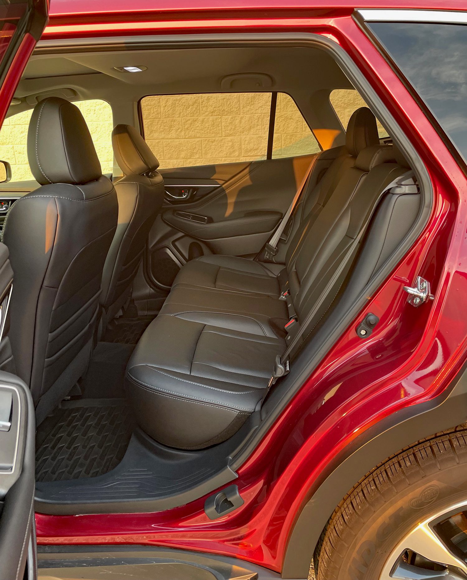 Our complaints regarding the interior materials of the subcompact Subaru Crosstrek do not extend to the Outback, at least not in Touring trim. The black-leather trim in our test car, punctuated tastefully with bright accents, felt upscale, and absolutely on brand for Subaru. And though designed on car architecture, the Outback is crossover roomy with big doors, large and welcoming seats, and plenty of glass area. Rear-seat space is similarly generous.