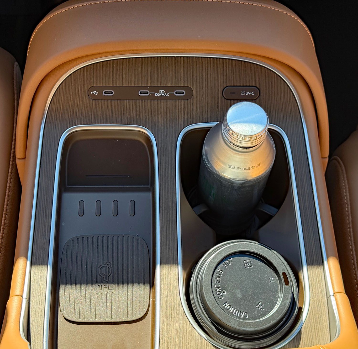 There were only a few things we didn’t like. First up, if you’re going to keep your phone in the wireless charger for more than a half hour, it may overheat. We tried it with our case on and off, and it had the same result: a message stating that charging had stopped due to our phone overheating. Next, we think the bottle holders on the door a bit awkward. They’re too narrow to hold a 17-ounch Yeti-brand container, so if you have coffee and water bottles for both front-seat passengers, you’ll be overloaded with beverages.