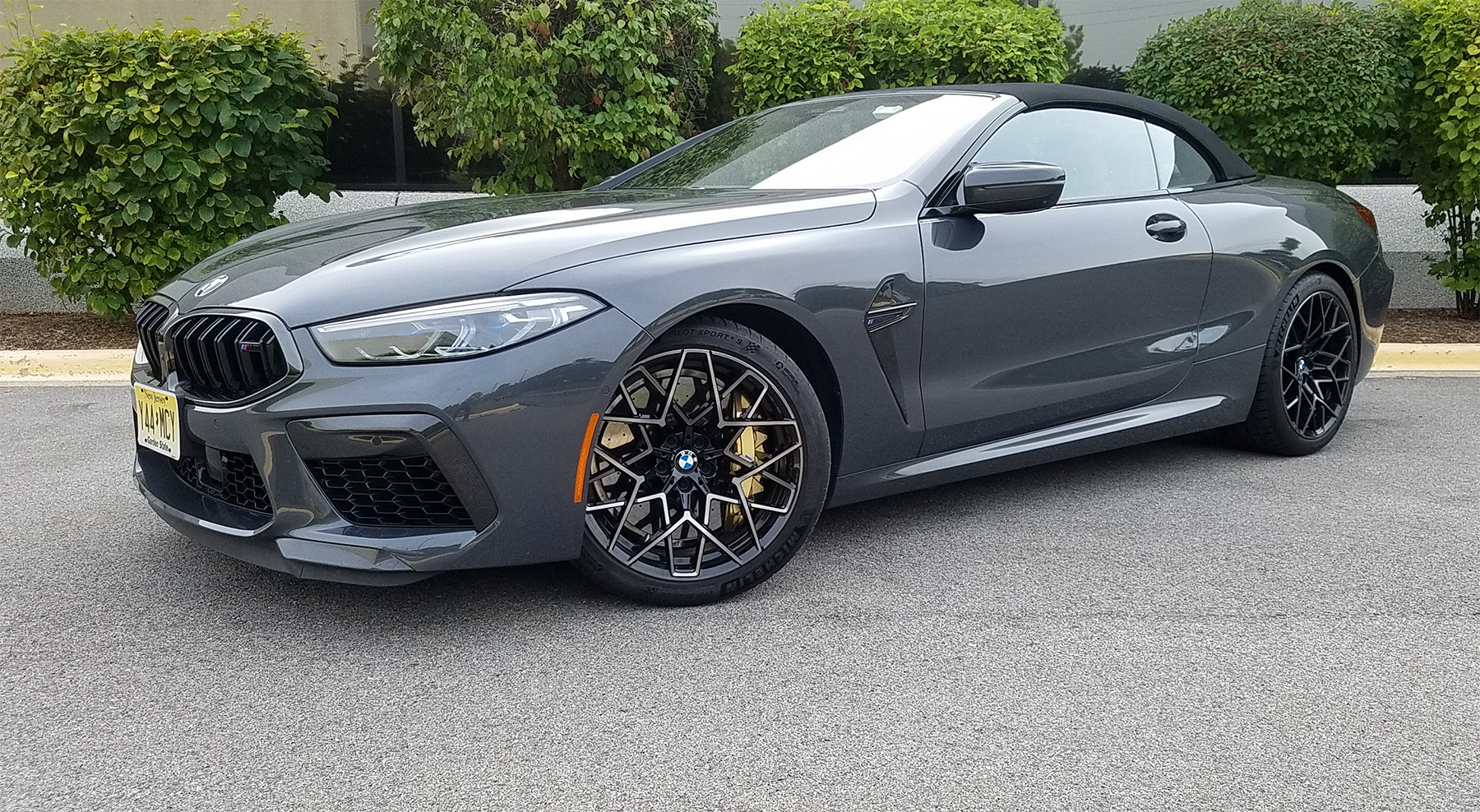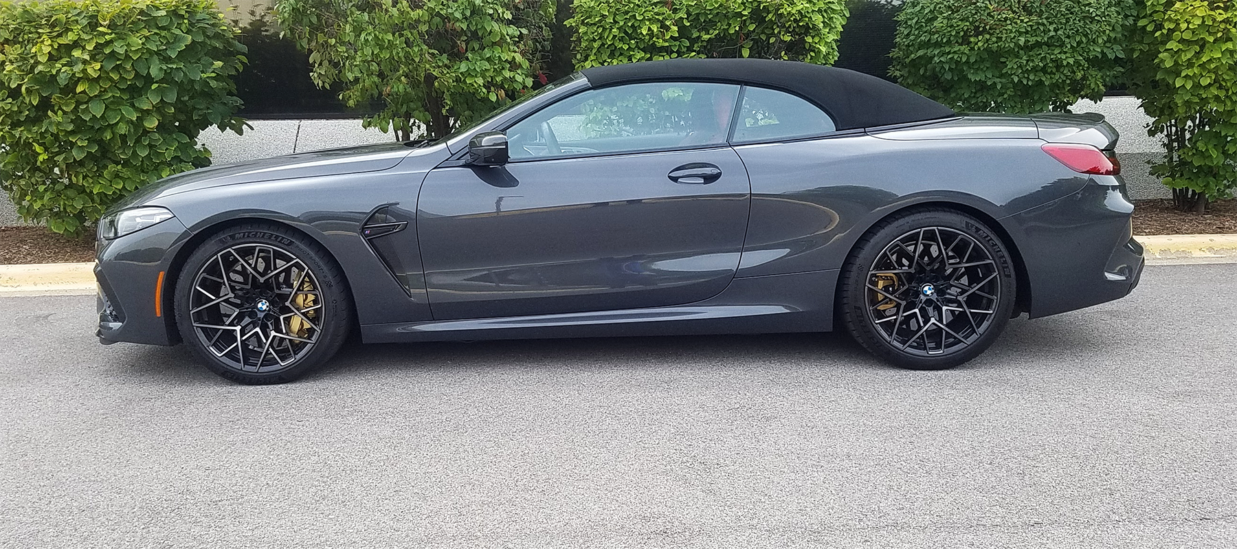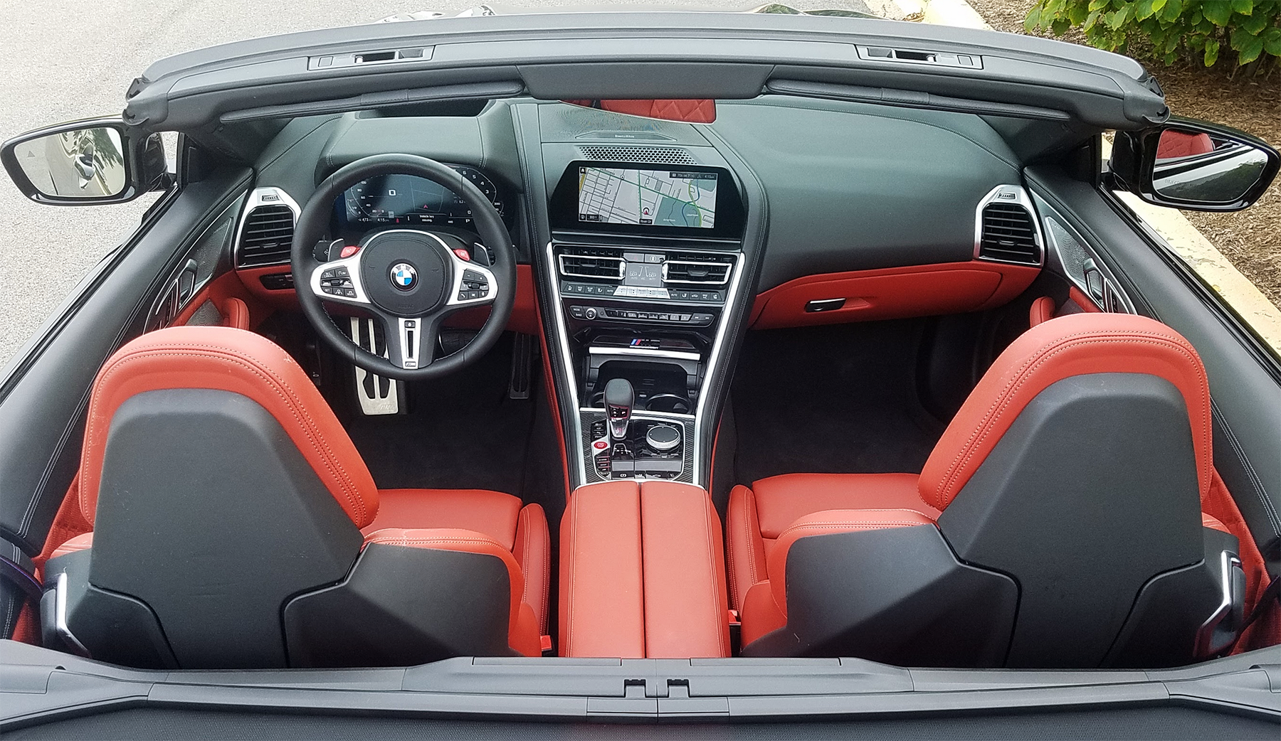 Drivers can select and save different engine and chassis characteristics (and access these combinations by tapping little red “M1” and “M2” levers atop the steering-wheel arms). Cycling through the engine menu to the “Sport+” setting—“Efficient” and “Sport” are the other choices—elicits a raucous exhaust blare at a press of the starter button, and menacing exhaust raps off throttle. Response to accelerator inputs is immediate and lusty. Considering its curb weight of 4560 pounds, the M8 Competition convertible is a quick car (the manufacturer cites 3.0 seconds to get from zero to 60 mph and includes launch control as a standard feature). Top speed is limited at 155 mph unless a buyer pays out $2500 for the M Driver’s Package option that raises the ceiling to 189 and buys the owner a day of training at one of the two BMW Performance Center schools in the U.S. This tester didn’t get anywhere near that loftier limit in expressway driving; he did average 17.9 mpg after driving 88 miles with 40 percent city-type motoring.