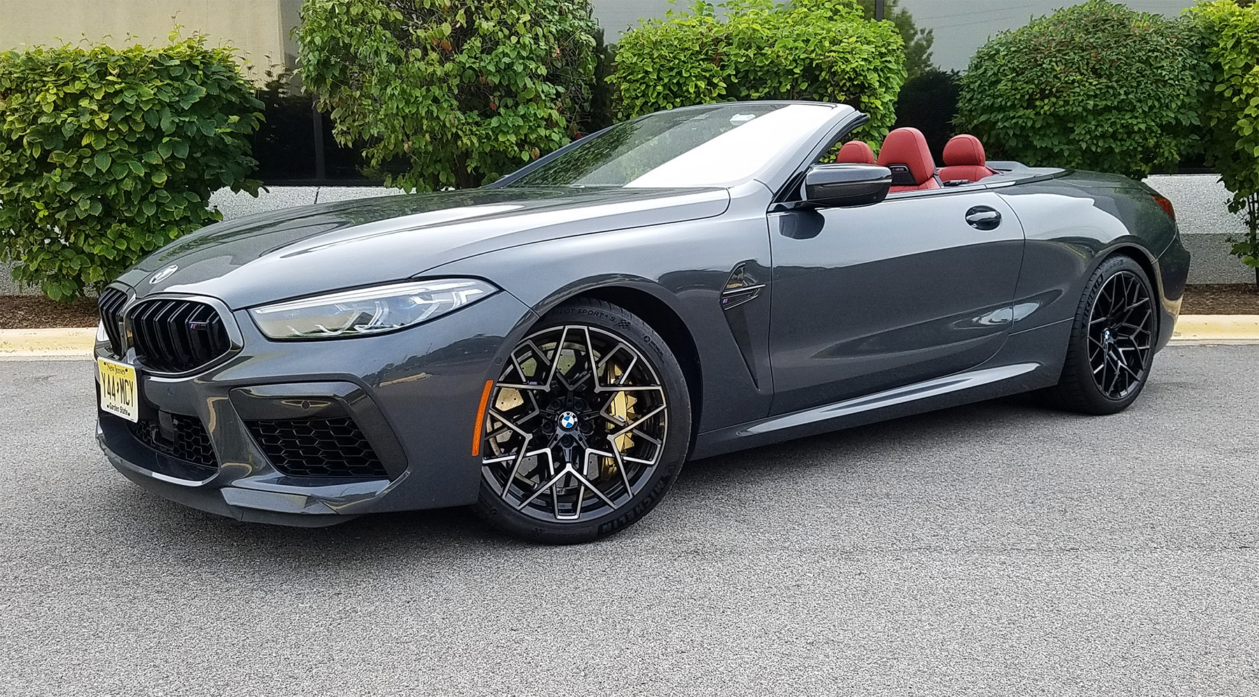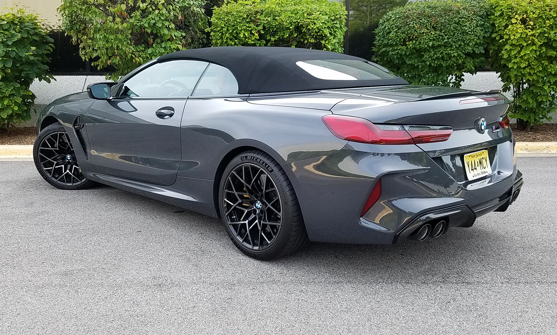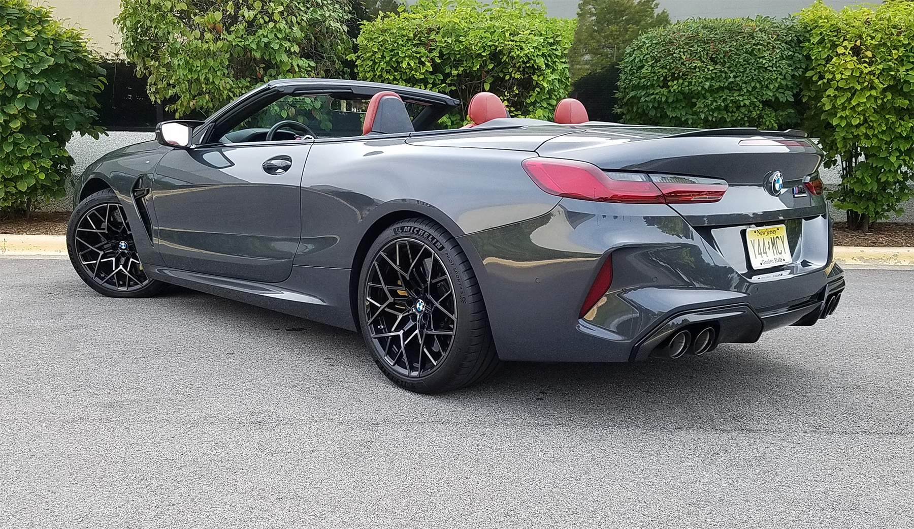 Drivers can select and save different engine and chassis characteristics (and access these combinations by tapping little red “M1” and “M2” levers atop the steering-wheel arms). Cycling through the engine menu to the “Sport+” setting—“Efficient” and “Sport” are the other choices—elicits a raucous exhaust blare at a press of the starter button, and menacing exhaust raps off throttle. Response to accelerator inputs is immediate and lusty. Considering its curb weight of 4560 pounds, the M8 Competition convertible is a quick car (the manufacturer cites 3.0 seconds to get from zero to 60 mph and includes launch control as a standard feature). Top speed is limited at 155 mph unless a buyer pays out $2500 for the M Driver’s Package option that raises the ceiling to 189 and buys the owner a day of training at one of the two BMW Performance Center schools in the U.S. This tester didn’t get anywhere near that loftier limit in expressway driving; he did average 17.9 mpg after driving 88 miles with 40 percent city-type motoring.