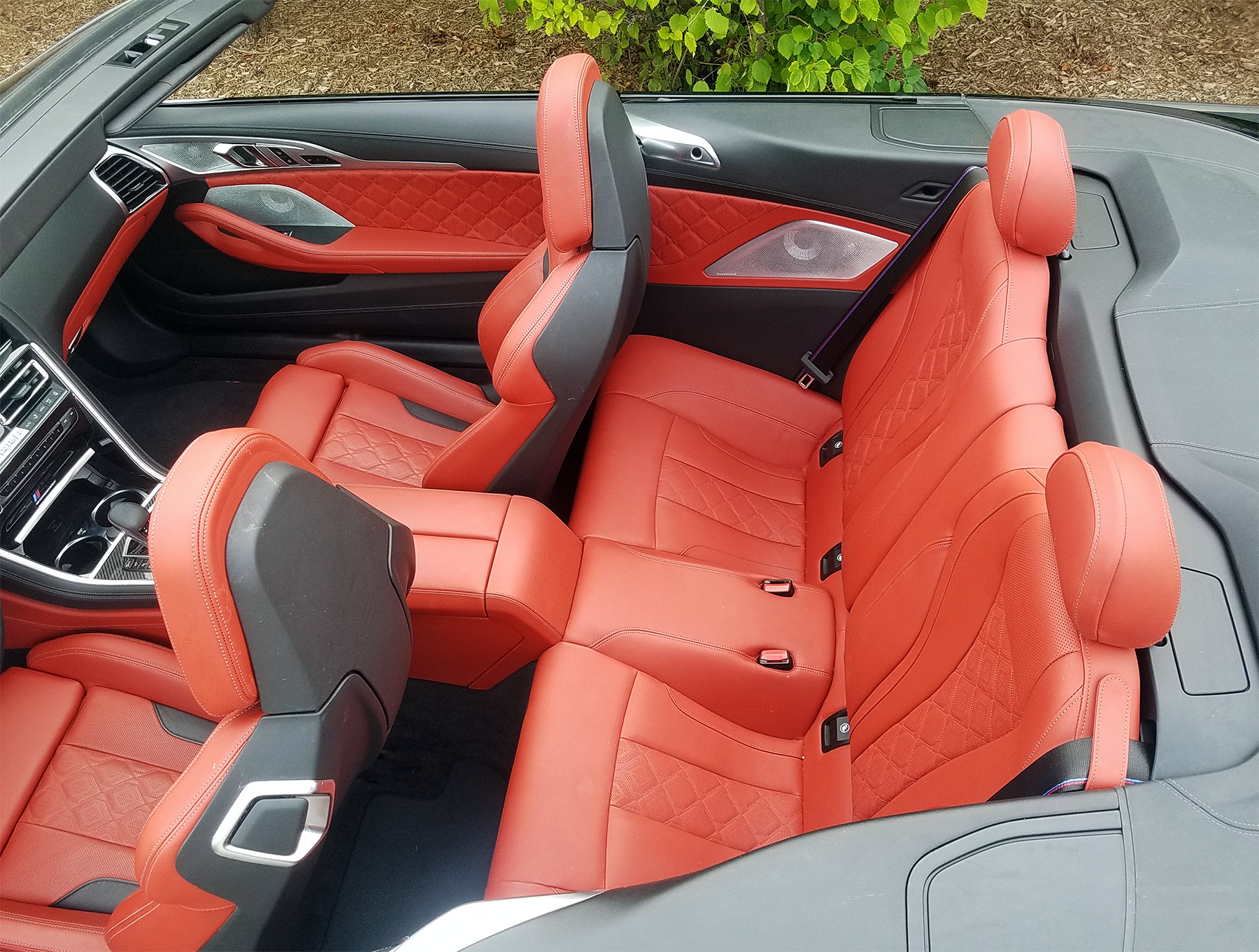 Driving a couple of 8-Series convertibles—CG’s first was a 2019 M850i—confirms that BMW has done a good job of creating a solid open-car body structure. It takes 15 seconds to open or close the multilayer fabric top, which stows out of sight under the deck. These operations can happen while on the move at speeds up to 30 mph. In top-down driving, the wind blocker was effective at cutting down buffeting at free-flowing tollway speeds. When fully buttoned up, the cabin is pretty quiet, though over-the-shoulder visibility is quite restricted.