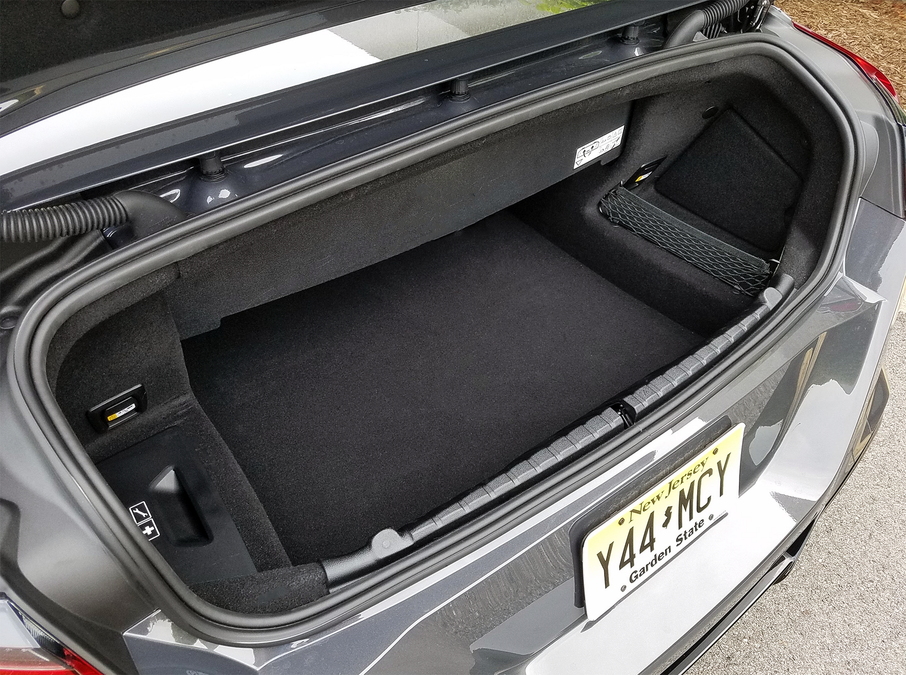 A sumptuous interior comes with standard carbon fiber highlights. Front passengers enjoy highly comfortable seats, with an available neck warmer for pleasant cruising in crisper climes. There are rear seats—at least that’s what those two things back there look like they are except for an abject lack of legroom. There’s actually a little bit more rear-seat headroom in the convertible than in the coupe, but that just points up the extreme limits of the closed car, not any great credit to the soft top. The trunk holds just 12 cubic feet of cargo that has to fit around the fixture that contains the lowered top, so the 60/40-split rear seats can make themselves useful as load space.