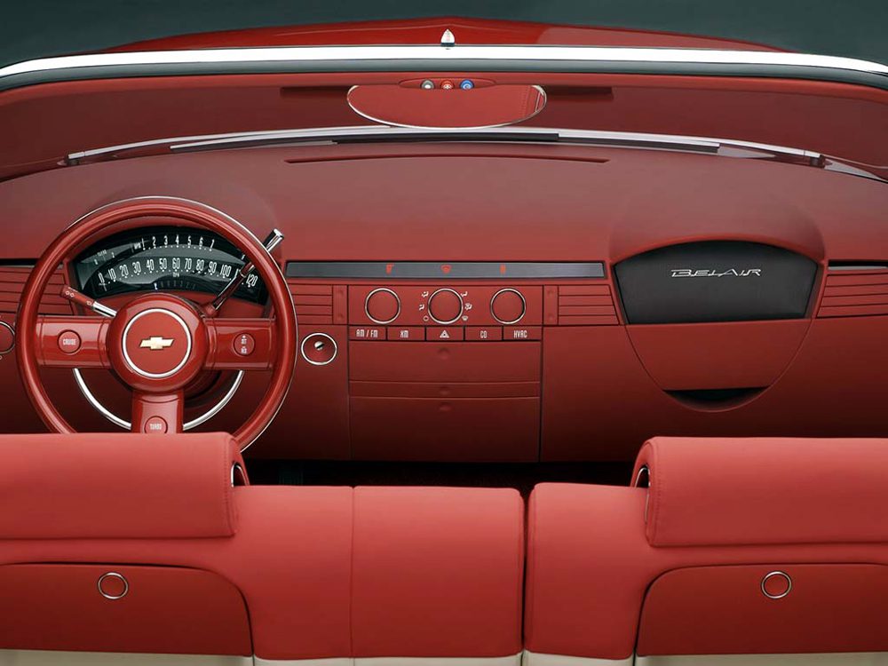 The Bel Air Concept featured a thick chrome windshield frame, round headlights, a bold-but-simple grille, and hints of tailfins. The concept was red with red-line tires on 18-inch alloy wheels.
