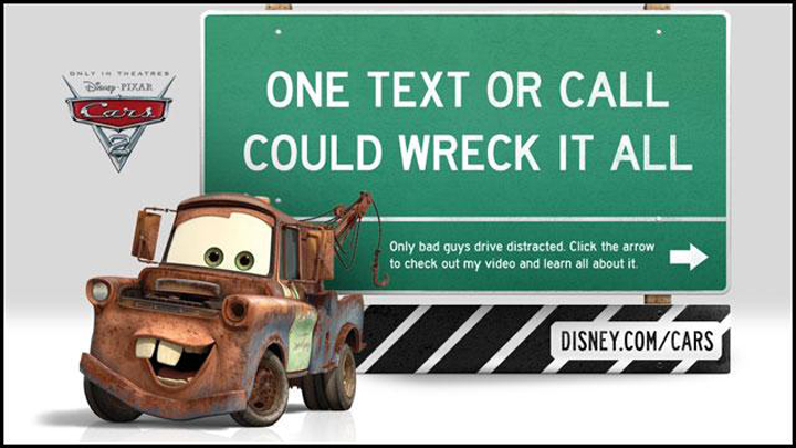 Believe it or not, the National Highway Traffic Safety Administration (NHTSA) is doing just that with a dedicated Website, www.distraction.gov. As you might expect, it uses statistics to dramatize the problem and makes virtuous appeals to get people behind it. I’m not sure how long the site has been going, but it has been long enough that NHTSA got Disney to provide a public-service announcement in which clips from Cars 2 were edited around the messages “One Text or Call Could Wreck it All” and “Only Bad Guys Drive Distracted.” (See? Bad guys.) That spot is no longer up (probably because Cars 2 came and went over a year ago), but it’s still available on YouTube (http://www.youtube.com/watch?v=G6Ahgpvc7fg&feature=player_embedded). It’s worth a look, but beware of the expletive-filled comments further down the page.