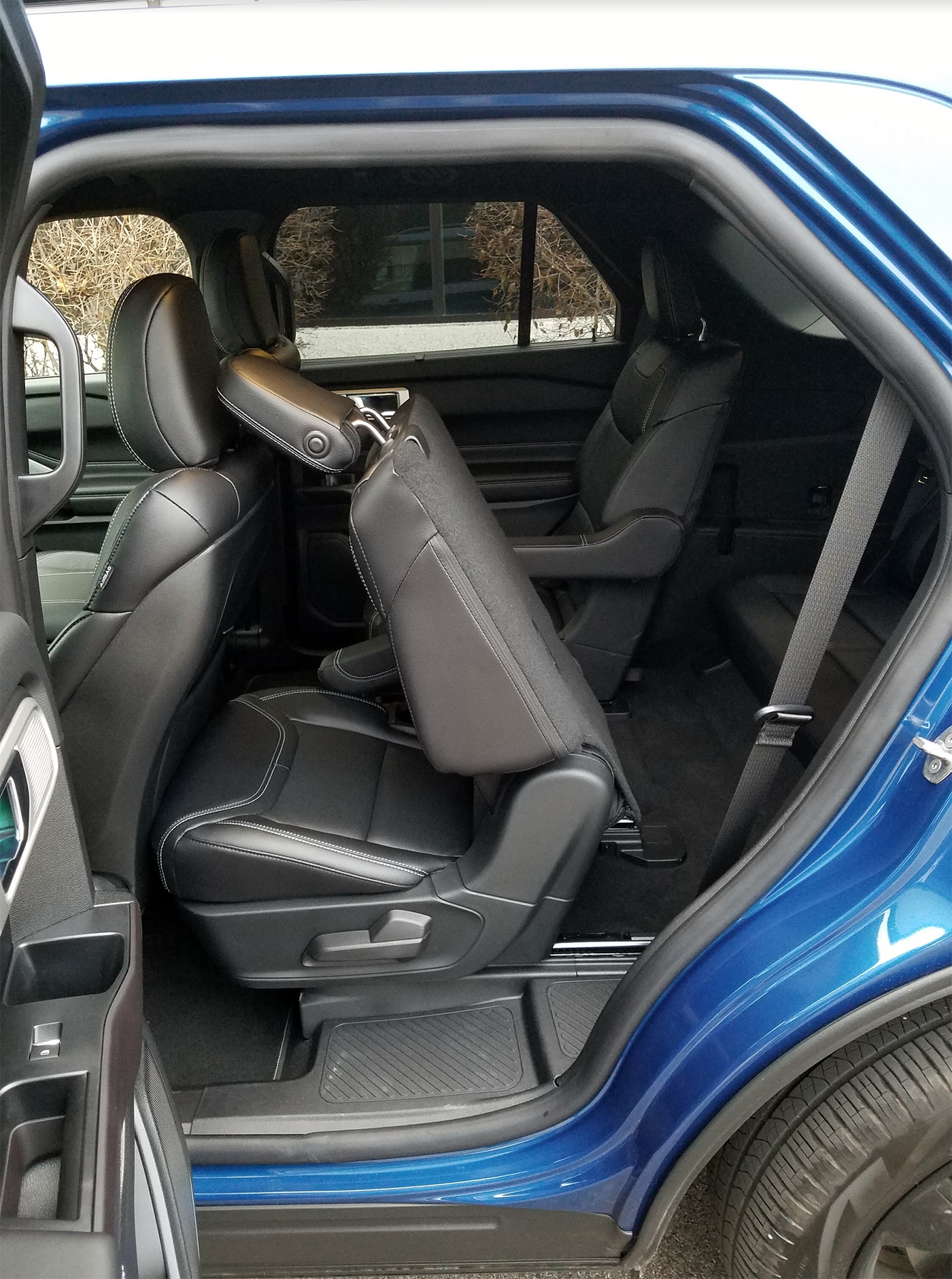 The front seats provide good side grip during aggressive driving but don’t stint on comfort the rest of the time—and the massage function was pretty nice. While some Explorers are set up to carry seven passengers, the ST is confined to six thanks to standard second-row captain’s chairs. These provide decent support, and they’re heated. Two third-row seats are best suited for kids, though smaller adults might be able to hang in there for a limited time. Middle seats track forward to assist back-row entry and exit. There’s good headroom and legroom in the front two rows. Step-in height isn’t particularly challenging, but over-the-shoulder driver vision is limited by the thickness of the roof pillars.
