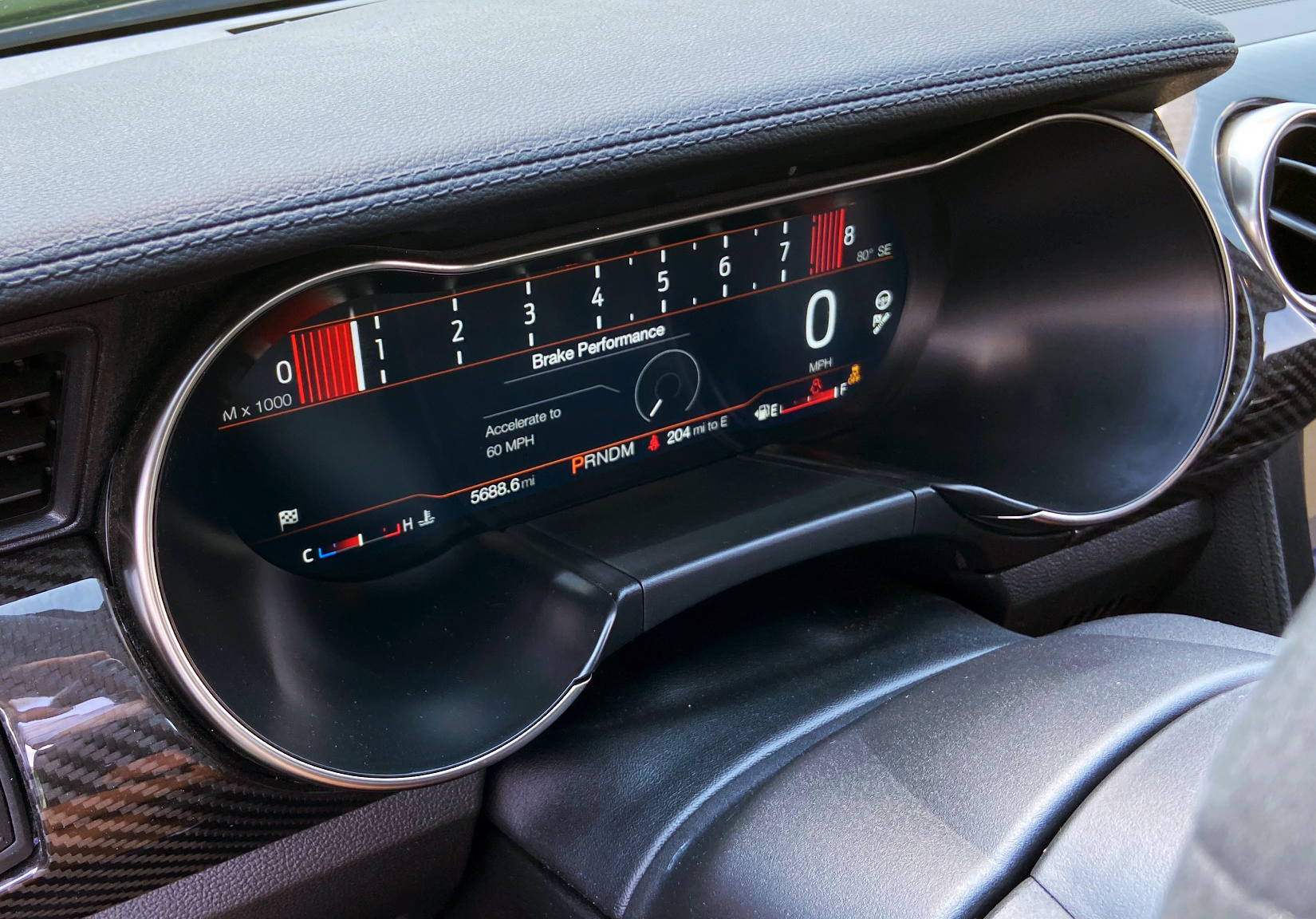 Drivers can cycle through standard Track Apps that show timing and vehicle-performance reports (such as 0-60-0-mph braking) in the electronic instrument cluster.