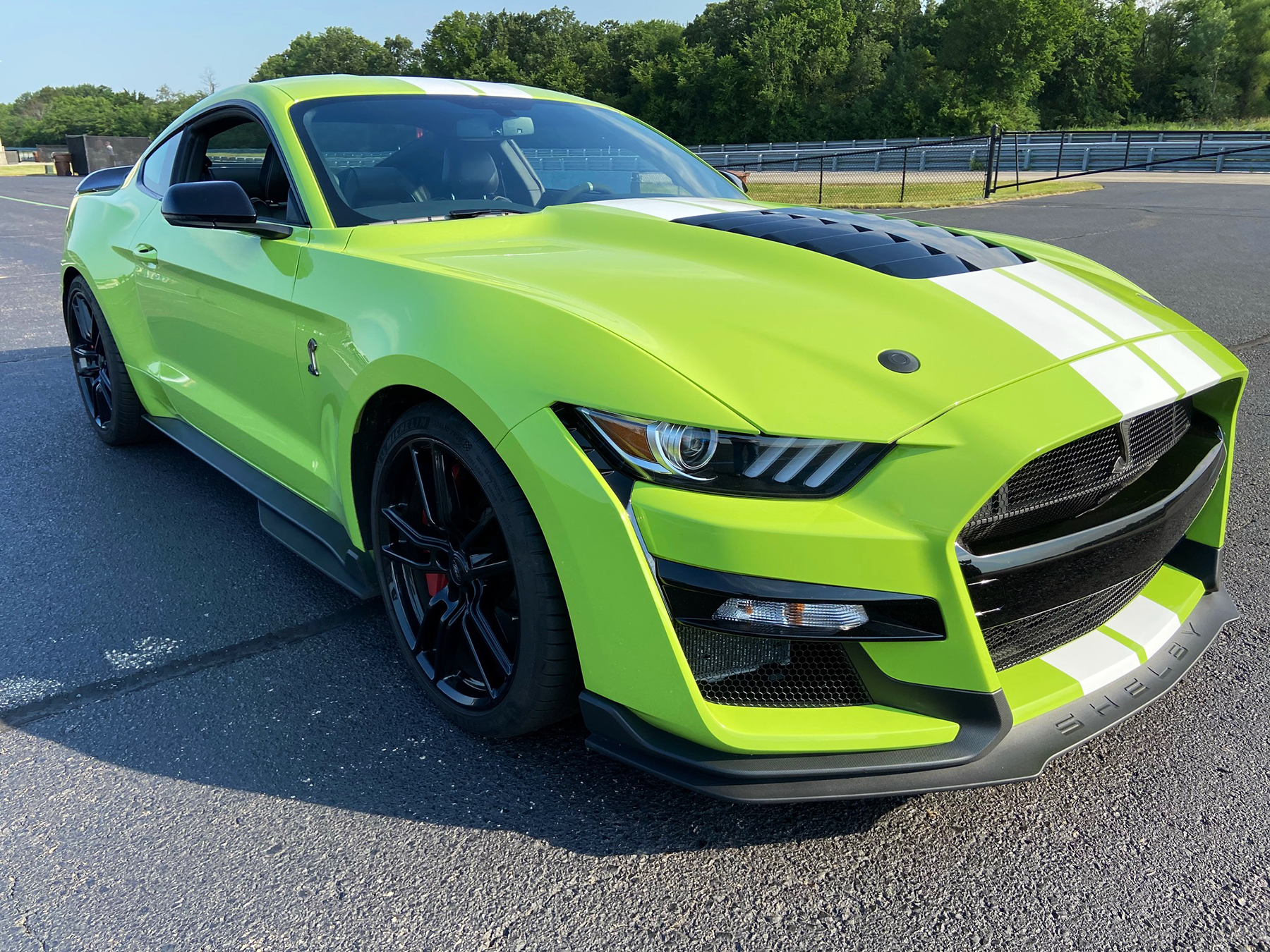 This first GT500 since 2014 starts at $73,995, including Gas Guzzler Tax and delivery charge. Designed to handle as well as accelerate, we’ll refer you to Consumer Guide’s First Spin report for an unbridled account of this powerhouse pony. When Ford brought the GT500 North American Track Tour to Autobahn Country Club in Joliet, Illinois, on a hot early July day, CG came out to soak up the car’s magnificent sound and some of its fury (per program limitations). It did, however, allow us to take a closer look at some of the GT500’s high-performance features that form the basis of this report.