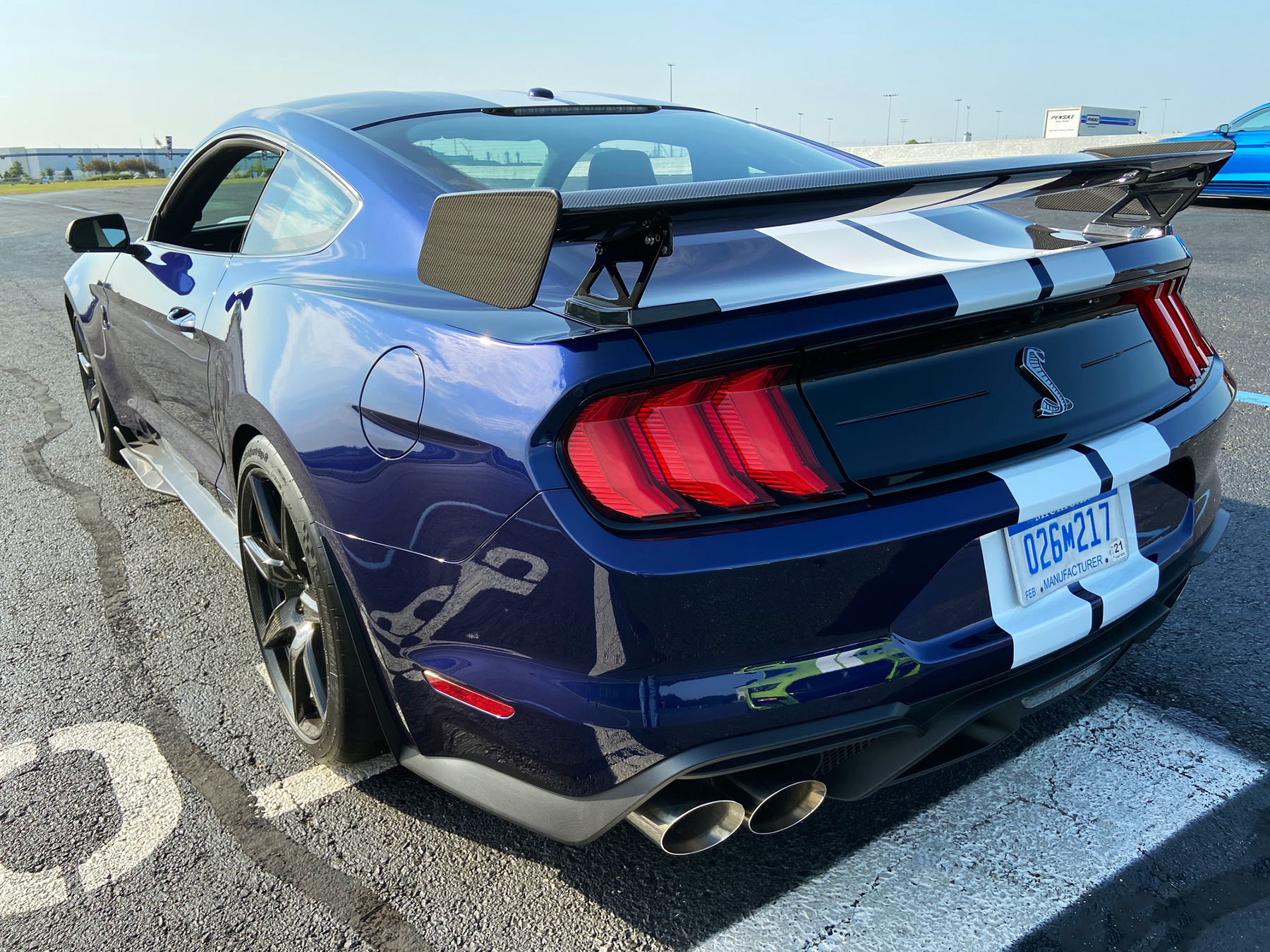 The standard rear spoiler (left) is considerably different from the adjustable wing (right) included with the Carbon Fiber Track Pack option. Another feature of the $18,500 group is a wheel-tire package with 20-inch carbon-fiber wheels shod with Michelin Pilot Sport Cup 2 tires designed specifically for the GT500. Ford says the 7-spoke rims reduce unsprung rotational weight by 50 pounds compared to the standard black-painted alloy wheels. The exceptionally grippy Cup 2 rubber replaces base Pilot Sport 4S footwear.