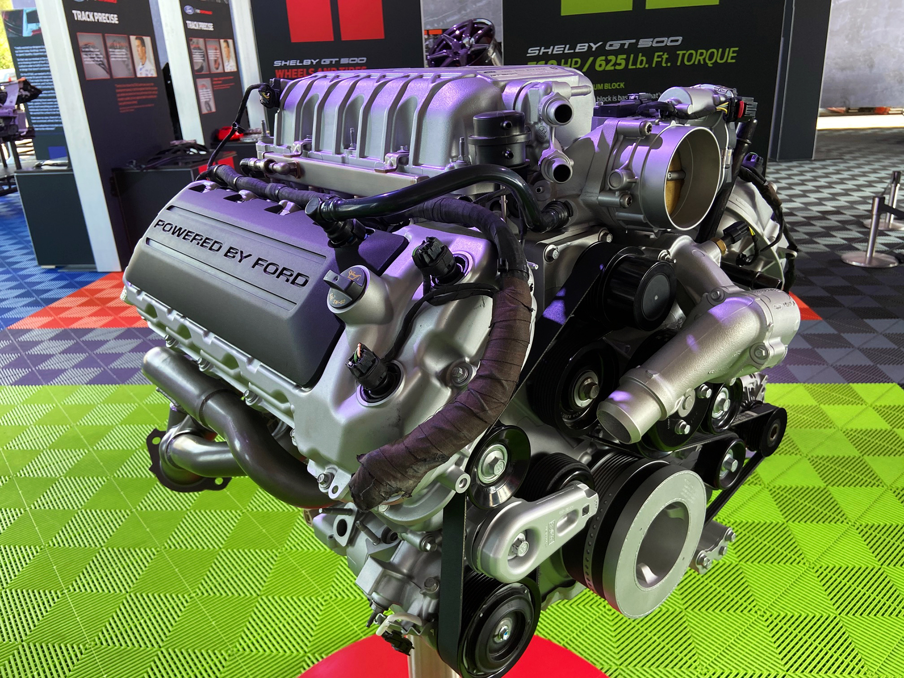 A 5.2-liter supercharged V8 with twin overhead camshafts produces 760 horsepower at 7300 rpm and 625 lb-ft of torque at 5000 rpm. It’s an engine that will pull like an overzealous dentist to the 7500-rev redline and deliver a claimed top speed of 180 mph. Where the naturally aspirated 5.2 in the 526-horse Shelby GT350 uses a flat-plane crankshaft, the GT500 engine employs a cross-plane crank that reduces vibration.