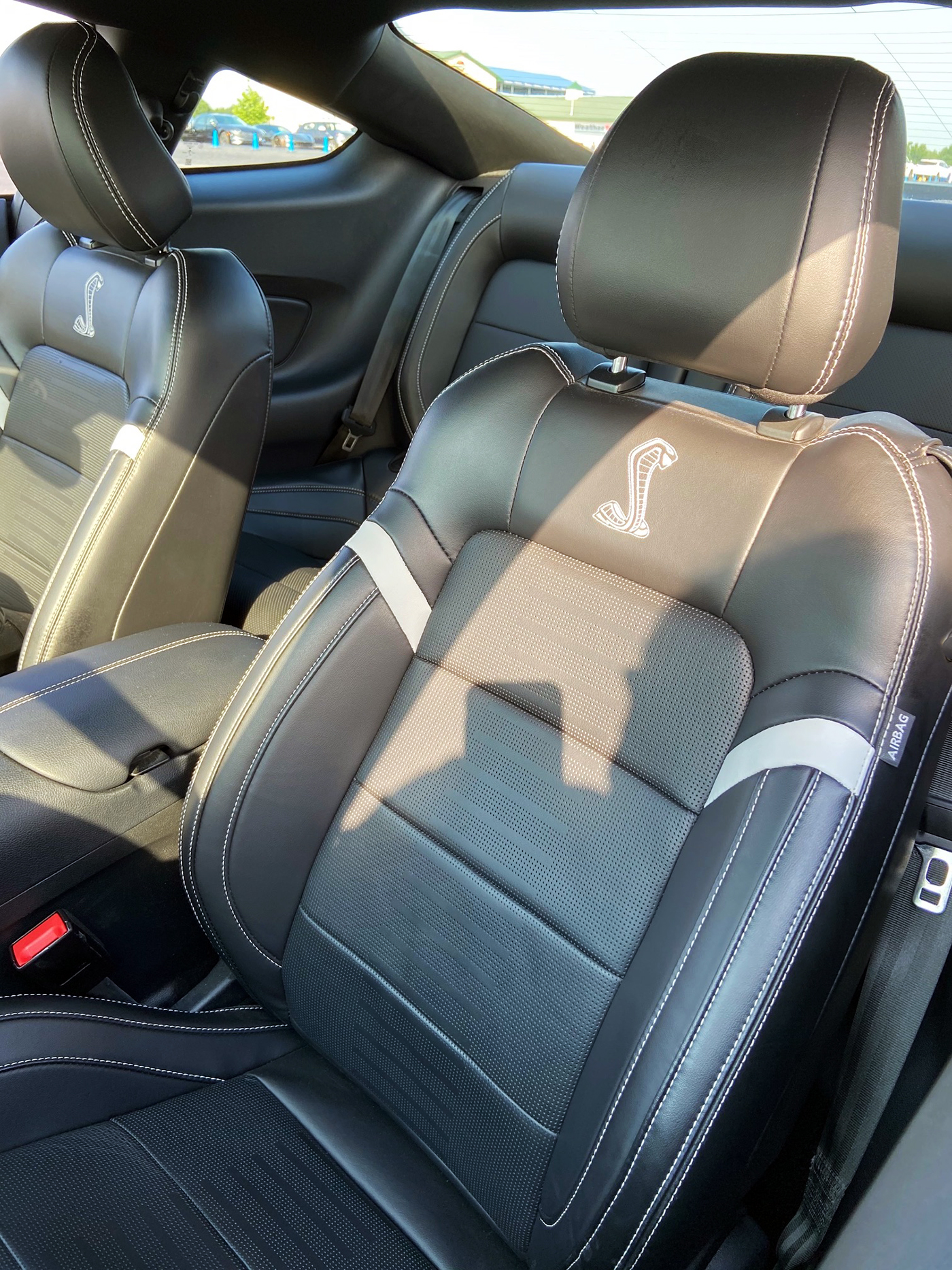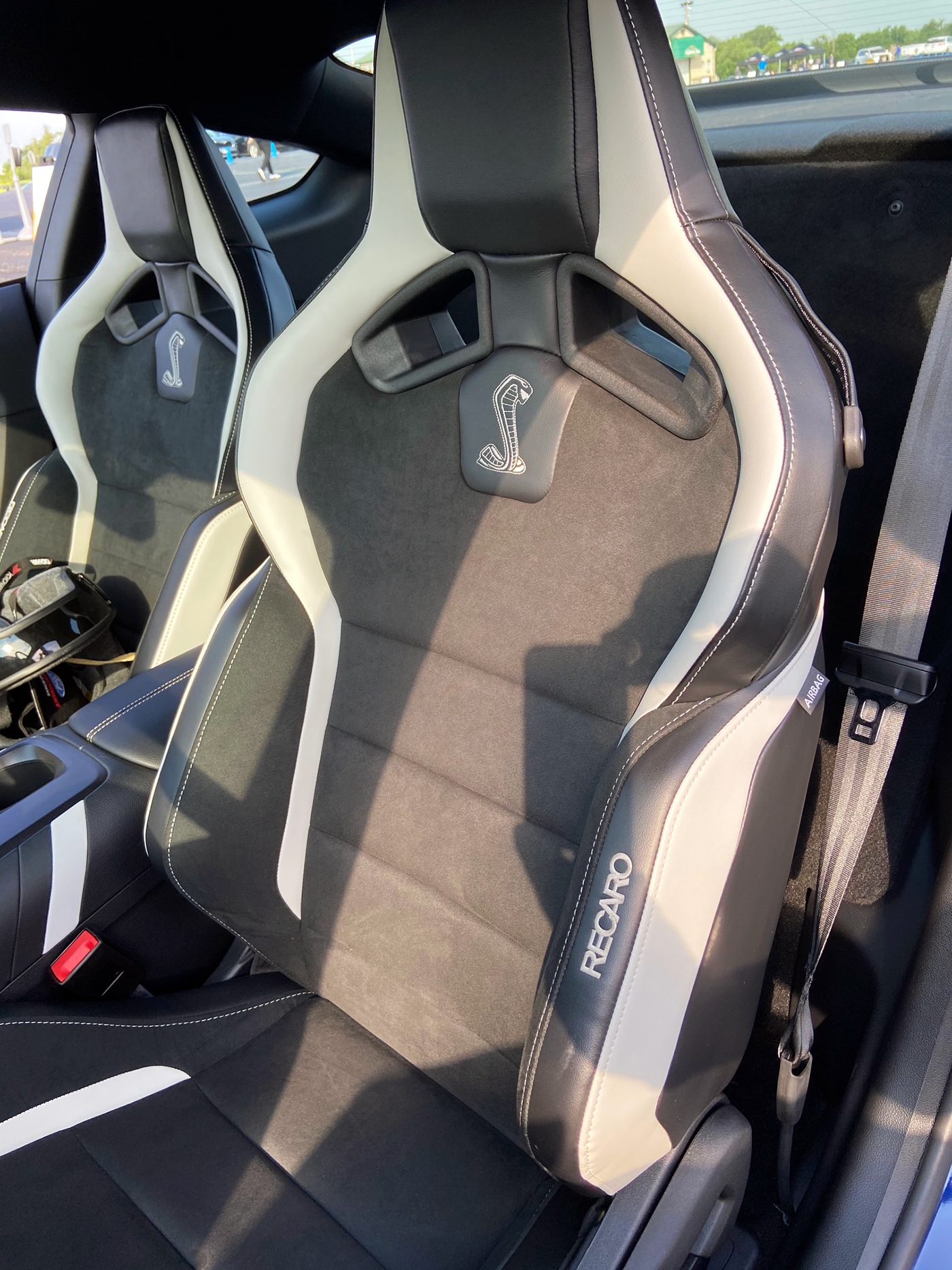 Standard GT500 bucket seats (left) and optional Recaro seats (right). The manually adjustable Recaros are snug but not constricting even if (like the author) you’re carrying a little extra “ballast.” Built off the basic Shelby seat frame, they incorporate all the necessary safety features to be street legal, but with integrated headrests and pass-throughs compatible with helmets and racing harnesses for track use.