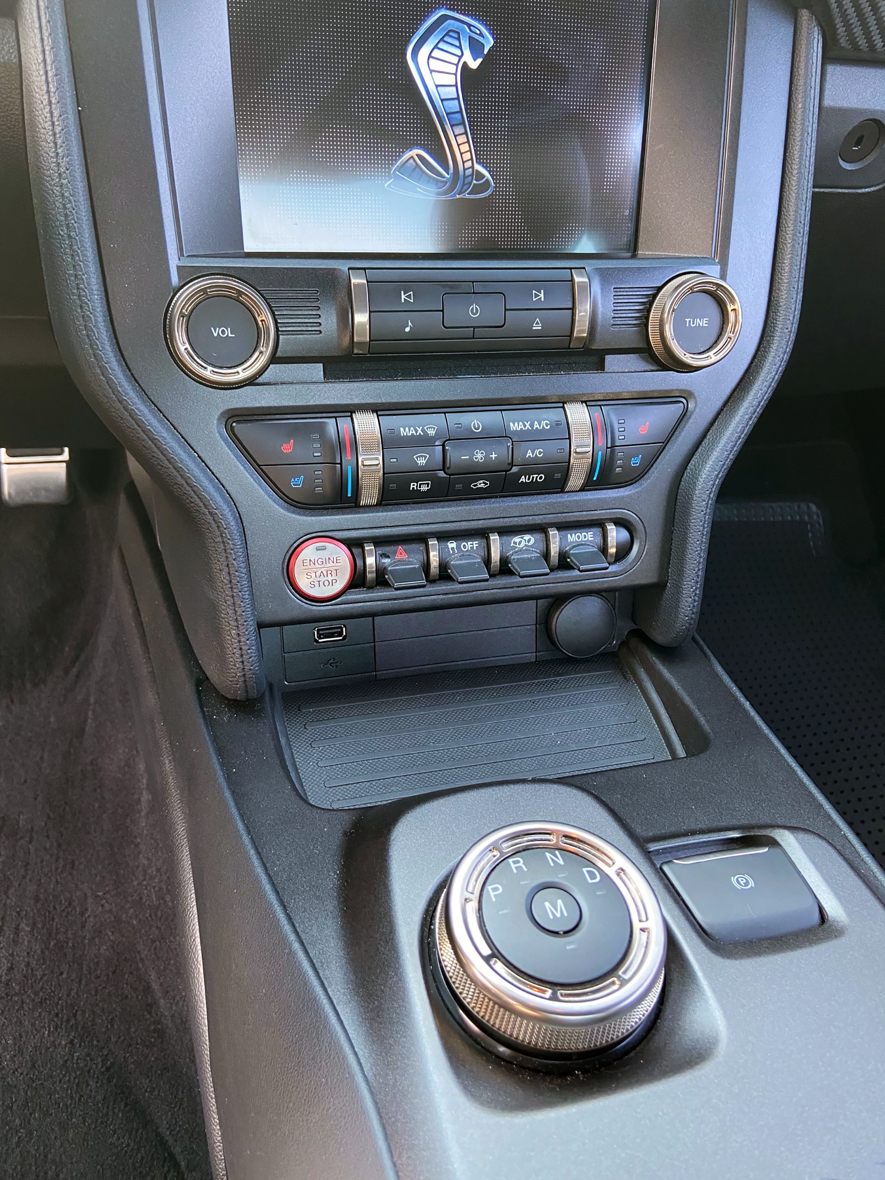 Flipping the GT500 on its side reveals its capable chassis with belly pans tailored to enhance aerodynamics and cooling, a dual-exhaust system that can be adjusted for sound volume, and “MagneRide” magnetorheological adaptable dampers. Ford also commissioned specifically calibrated components from suppliers, such as the Michelin tires and the Tremec 7-speed dual-clutch automated-manual transmission. Brakes are forceful and massive Brembo-supplied binders. Comparing the 2020 car to the very first Shelby GT-500 of 1967, Ford notes that the current model’s 16.5-inch front brake rotors are larger in diameter than the wheels of its famous forebear, and today’s 6-piston caliper body is wider than the rims on the Carroll Shelby-blessed original.