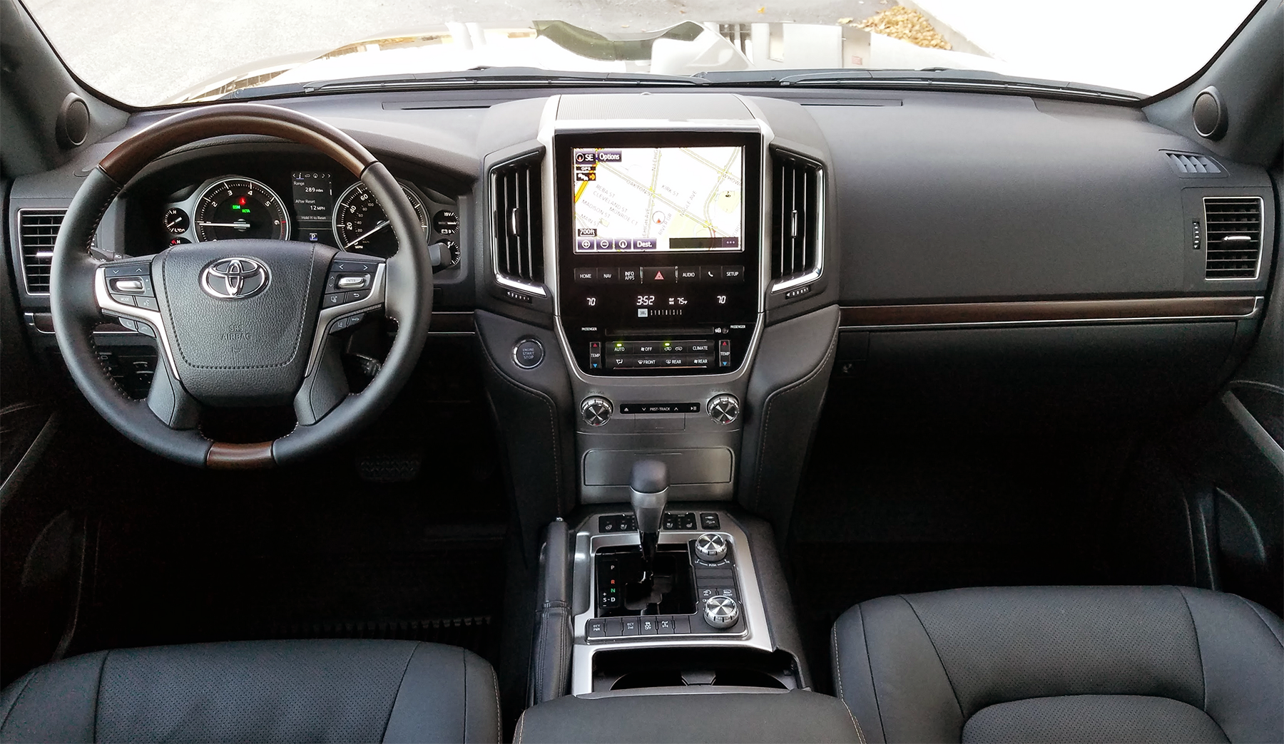 Otherwise, this dressed-up elder of Toyota showrooms (the current Land Cruiser fundamentally dates to 2007) comes pretty well equipped—as it should for almost 90-large. Seats are heated and ventilated in front and heated in the second row. The driver occupies a 10-way power-adjustable seat with memory settings. Four-zone automatic climate control, heated leather-wrapped steering wheel, power sunroof, Qi wireless charging, rain-sensing windshield wipers, push-button starting, front and rear parking assist, blind-spot monitor, and rear cross-traffic alert are other comforts and conveniences. The Toyota Safety Sense tech bundle adds pre-collision braking, pedestrian detection, lane-departure warning and mitigation, and adaptive cruise control. The audio system is a 14-speaker JBL unit. A 9-inch touchscreen shows audio (including satellite radio), climate, and navigation displays.